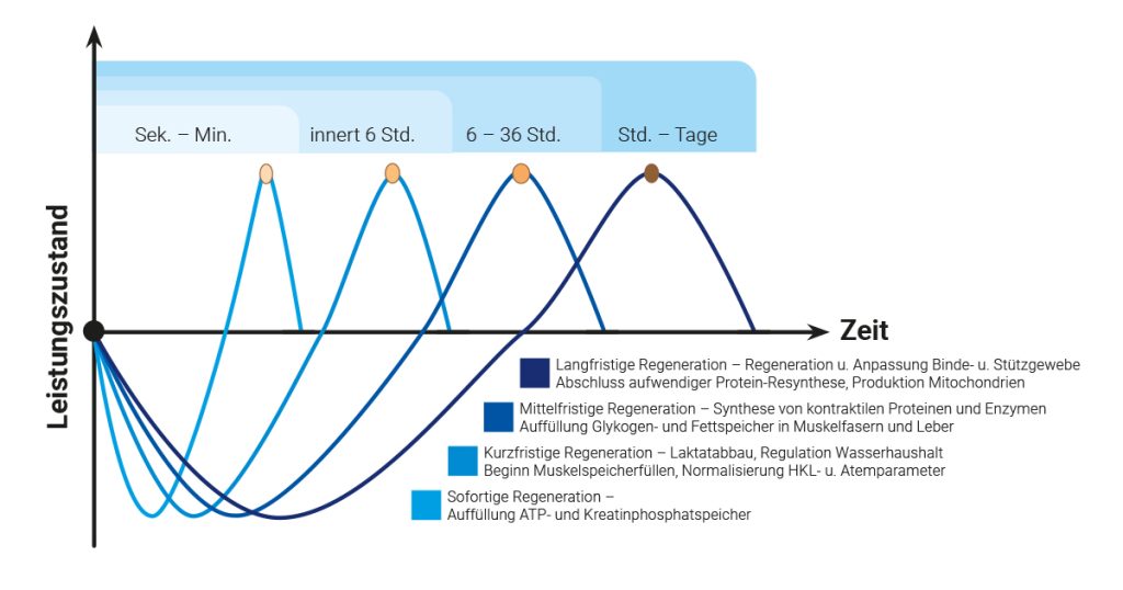 Der Regenerationsprozess nach körperlicher Belastung beinhaltet im Wesentlichen folgende (physiologische) Mechanismen: Abbau von Stoffwechselendprodukten, Wiederherstellung der metabolischen Homöostase, Normalisierung der neurovegetativen und psychoregulativen Homöostase, Wiederherstellung der Glykogenspeicher sowie das Reparieren beschädigter Myofibrillen der Muskelzellen (Nédélec et al., 2013).